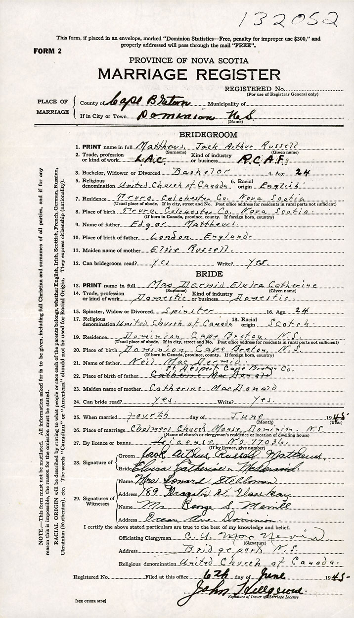 PLACE OF MARRIAGE County of Cape Breton in City or Town Dominion
