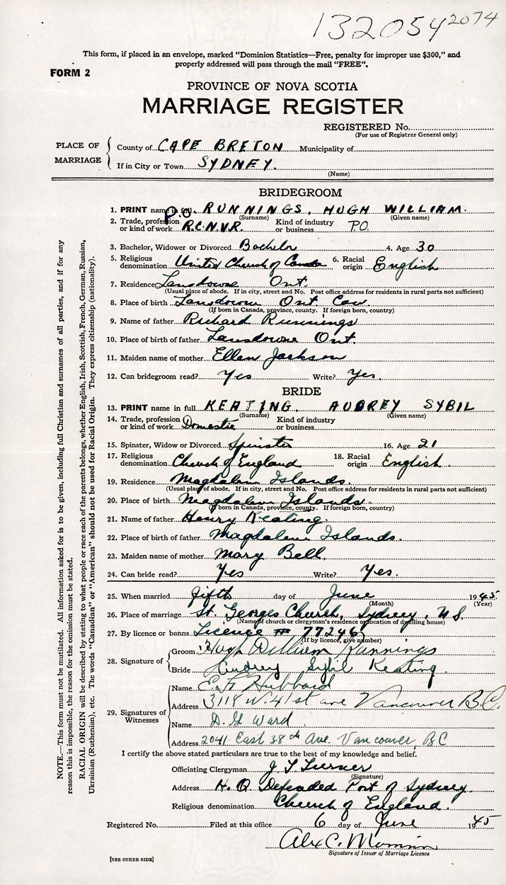 PLACE OF MARRIAGE County of Cape Breton in City or Town Sydney