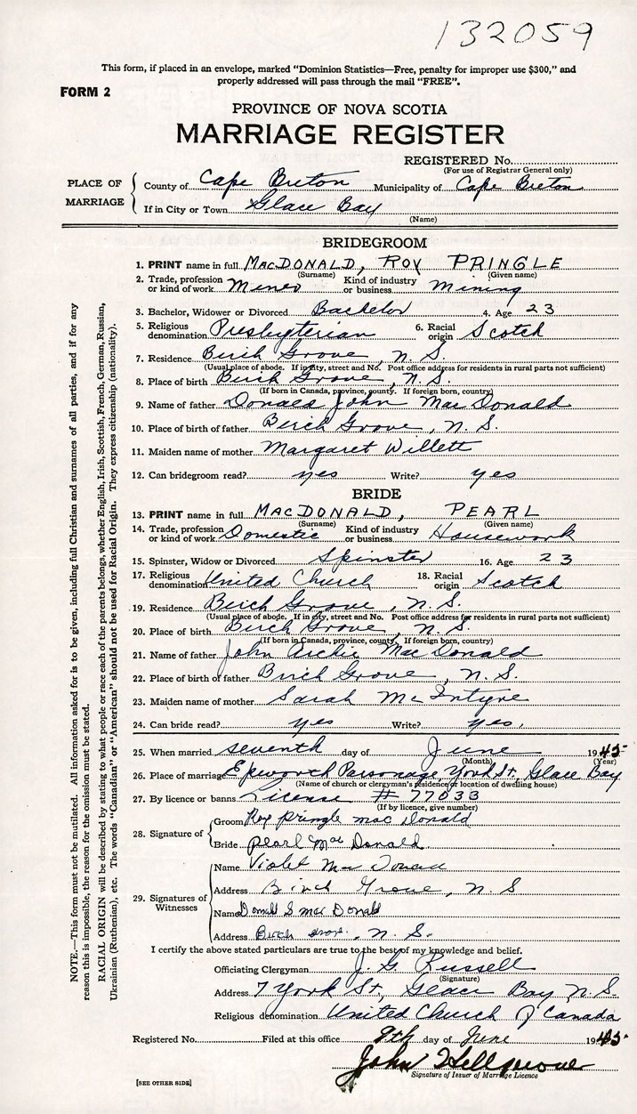 PLACE OF MARRIAGE County of Cape Breton in City or Town Glace Bay