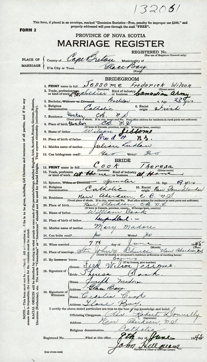 PLACE OF MARRIAGE County of Cape Breton in City or Town New Aberdeen, Glace Bay