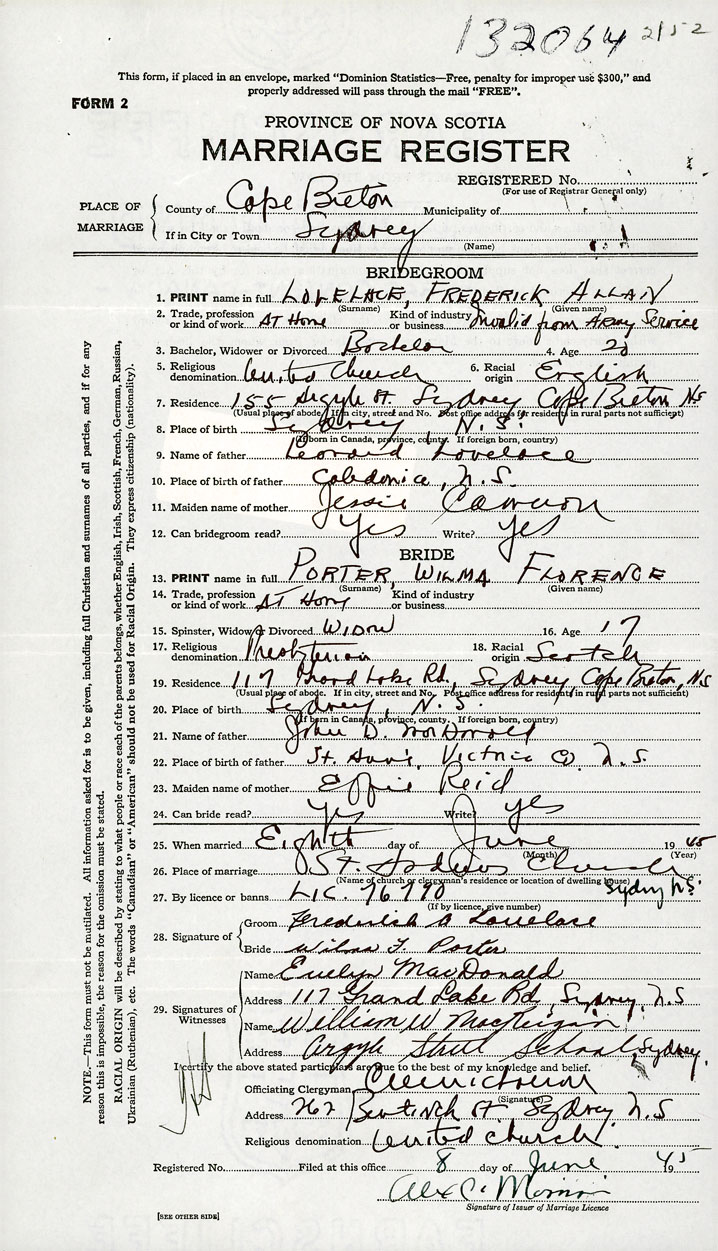 PLACE OF MARRIAGE County of Cape Breton in City or Town Sydney