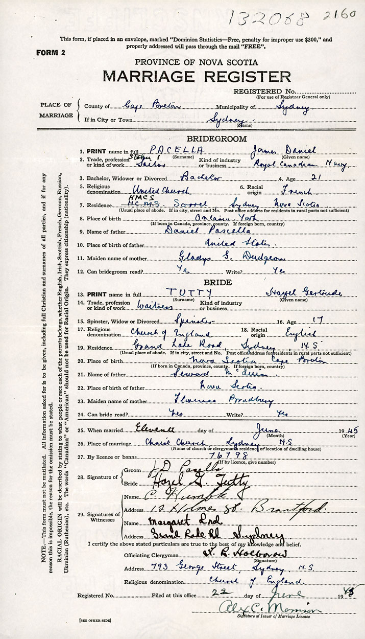 26. Place of marriage Christ Church Sydney, Cape Breton County