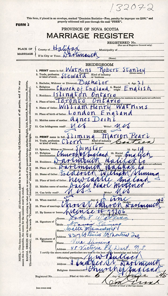 PLACE OF MARRIAGE County of Halifax in City or Town Dartmouth