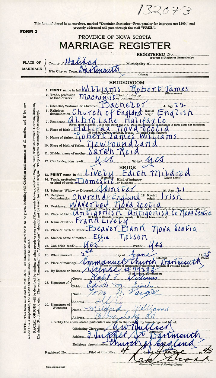26. Place of marriage Emmanuel Church Dartmouth, Halifax County