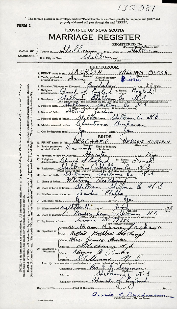 26. Place of marriage Shelburne, Shelburne County