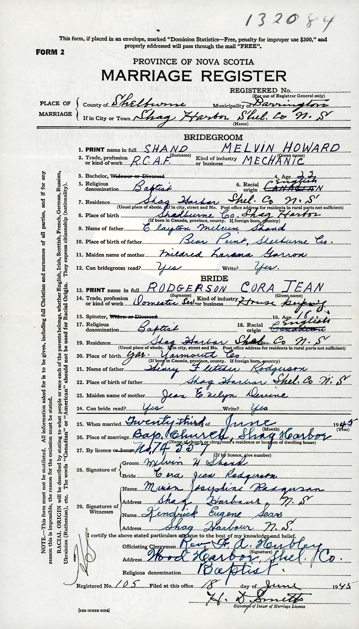 PLACE OF MARRIAGE County of Shelburne in City or Town Shag Harbour