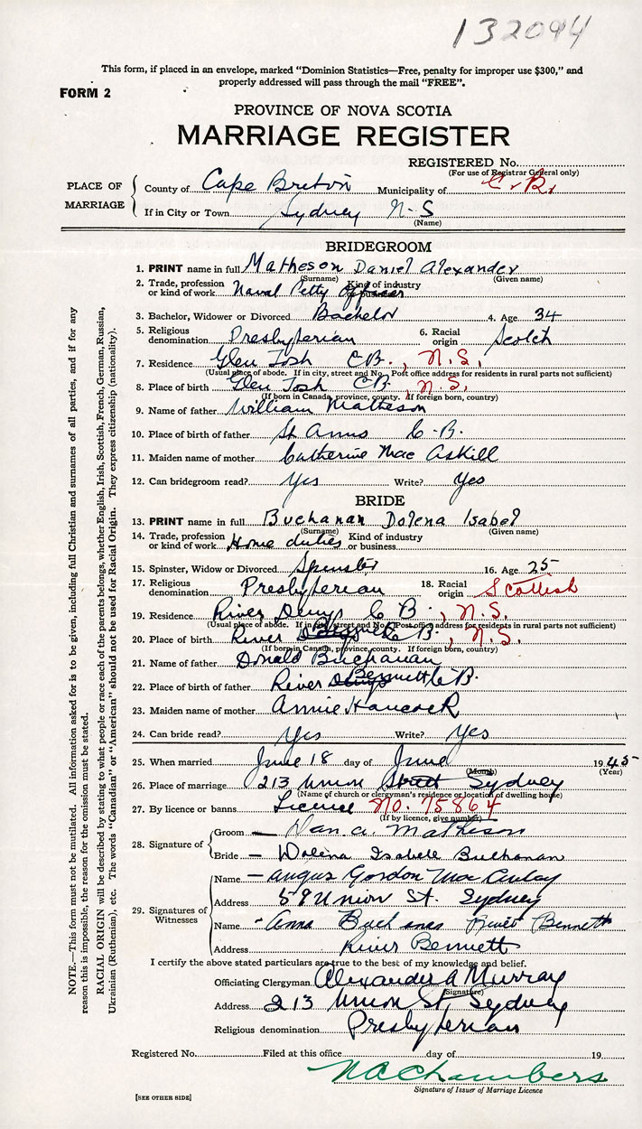 26. Place of marriage 213 Union Street Sydney, Cape Breton County