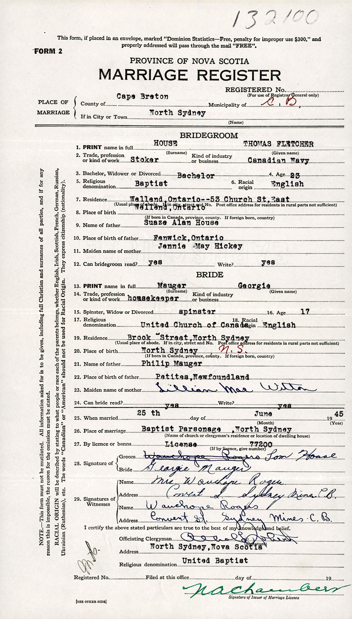 26. Place of marriage Baptist Parsonage North Sydney, Cape Breton County