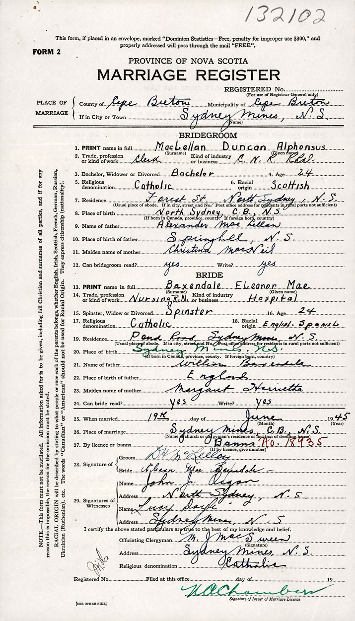 PLACE OF MARRIAGE County of Cape Breton in City or Town Sydney Mines