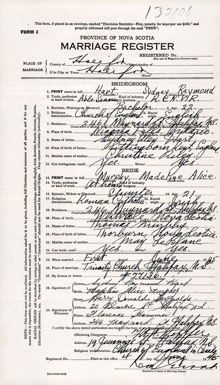 PLACE OF MARRIAGE County of Halifax in City or Town Halifax