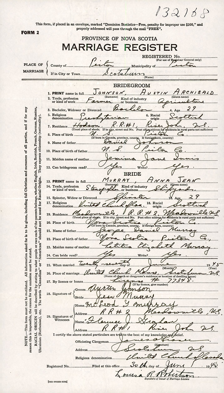 26. Place of marriage United Church Manse Scotsburn, Pictou County