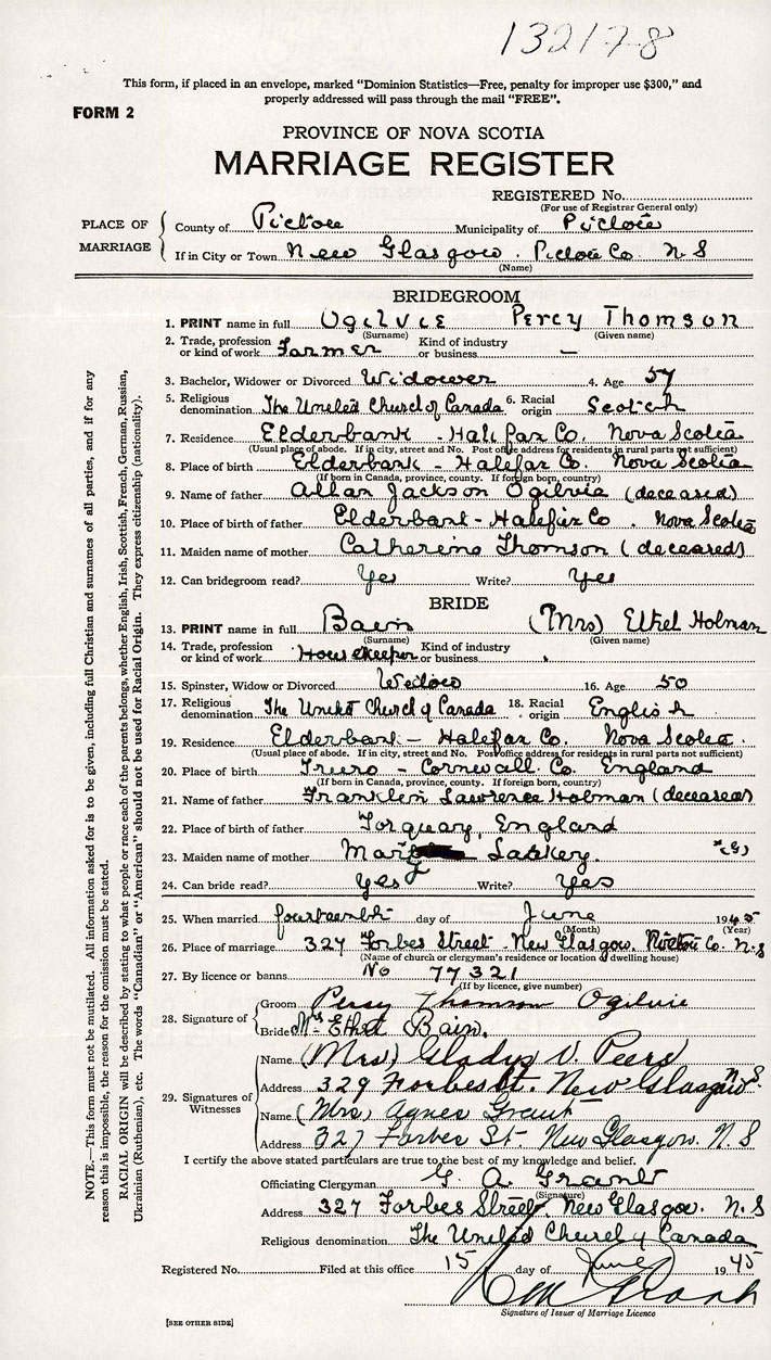 26. Place of marriage 327 Forbes New Glasgow, Pictou County