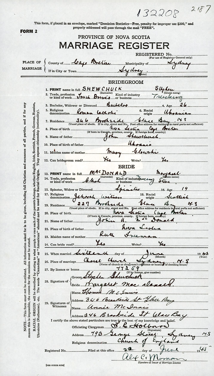 26. Place of marriage Christ Church Sydney, Cape Breton County
