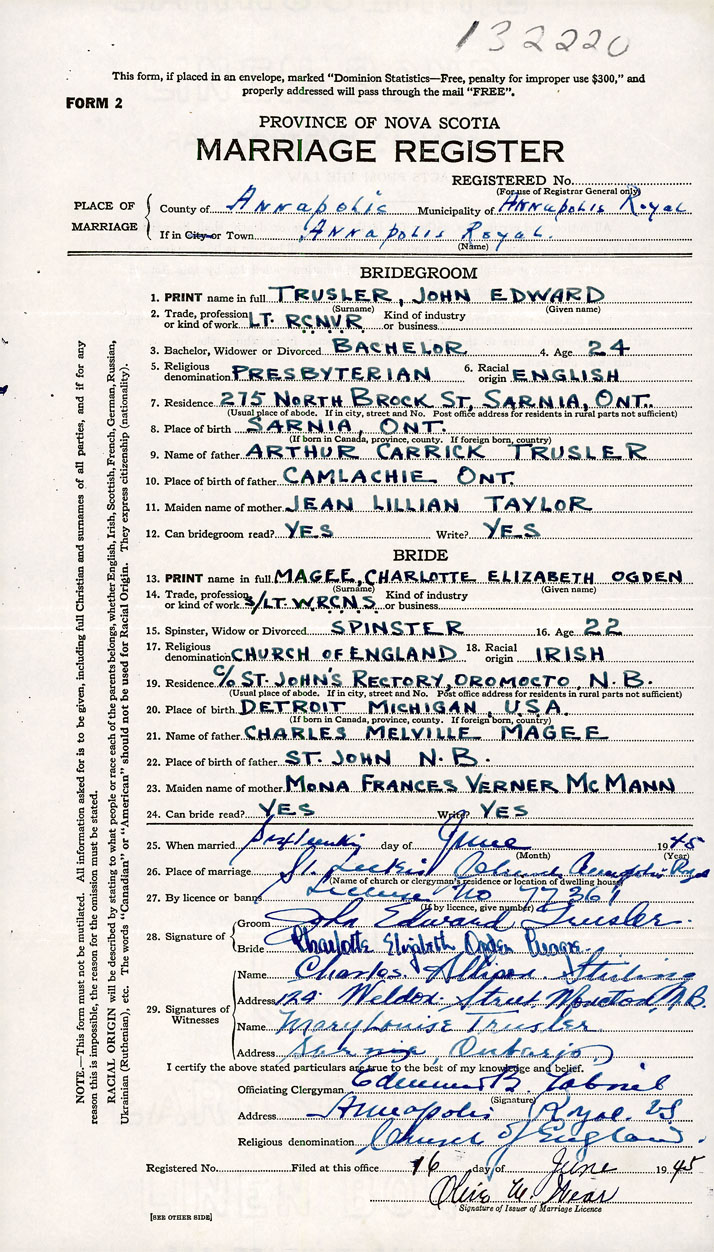 PLACE OF MARRIAGE County of Annapolis in City or Town Annapolis Royal