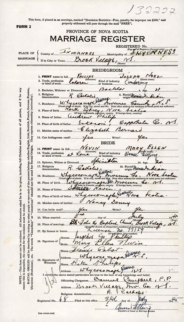 20. Place of birth Whycocomagh Res., Inverness Co., N.S.