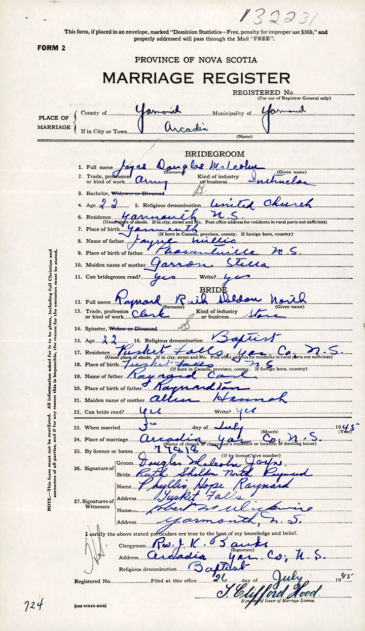 26. Place of marriage Acadia Yarmouth , Yarmouth County