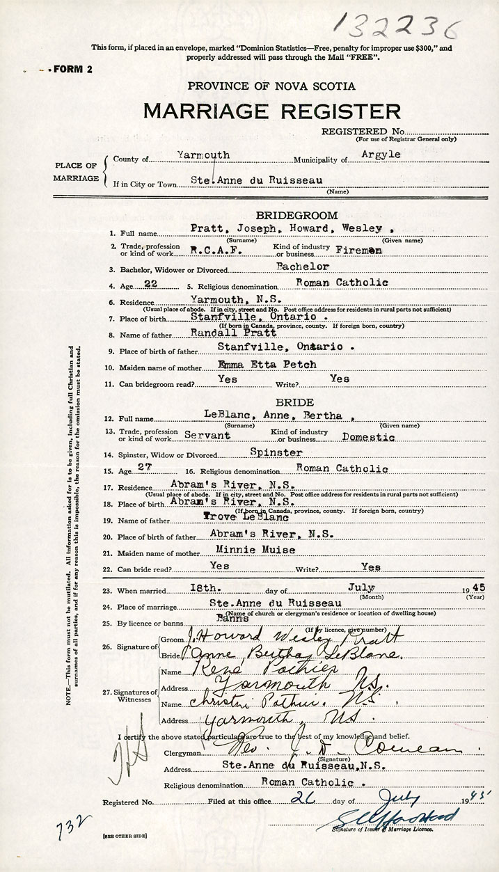 26. Place of marriage Ste. Anne du Ruisseau, Yarmouth County