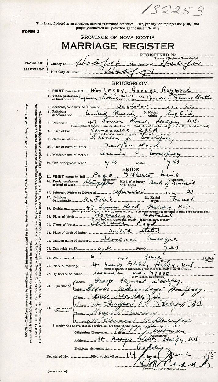 PLACE OF MARRIAGE County of Halifax in City or Town Halifax