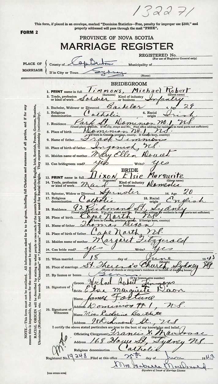 26. Place of marriage St. Theresa's Church Sydney, Cape Breton County