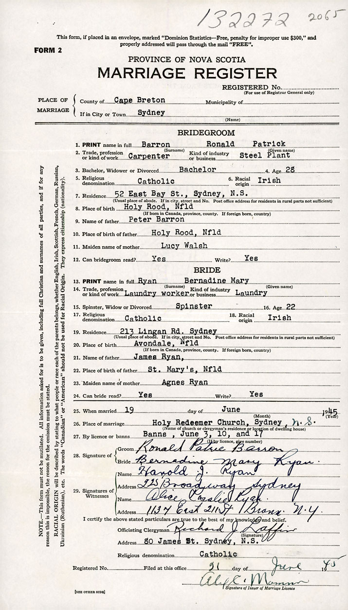 26. Place of marriage Holy Redeemer Church Sydney, Cape Breton County