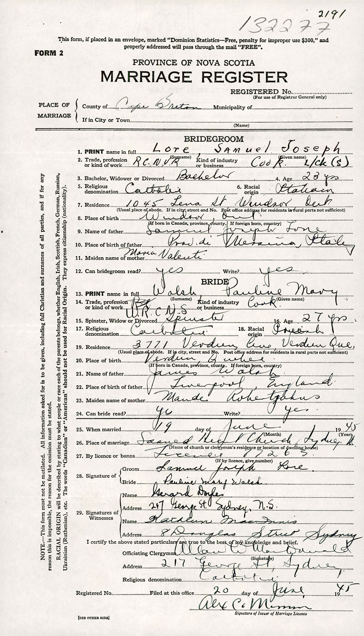 26. Place of marriage Sydney, Cape Breton County