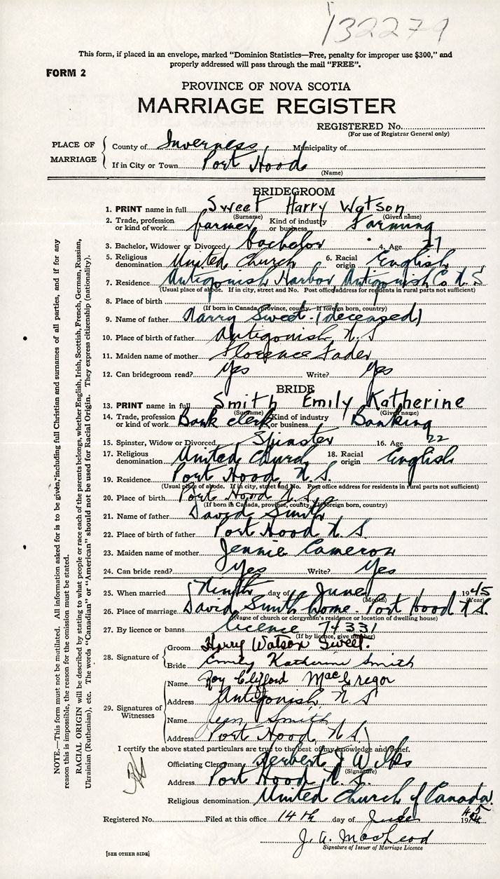 26. Place of marriage David Smith Home Port Hood, Inverness County