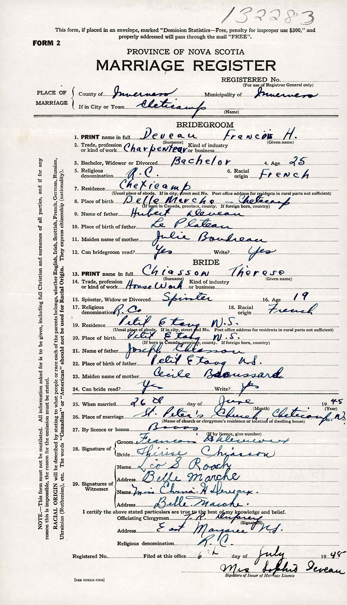 PLACE OF MARRIAGE County of Inverness in City or Town Cheticamp