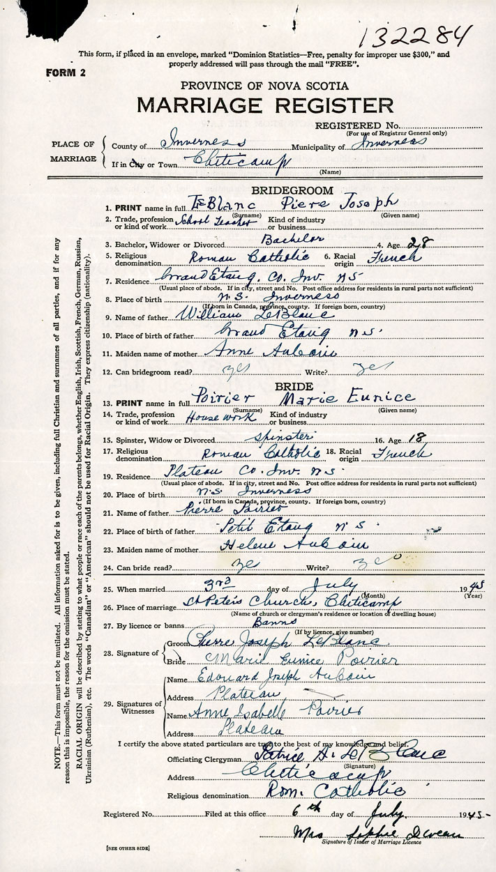 PLACE OF MARRIAGE County of Inverness in City or Town Cheticamp