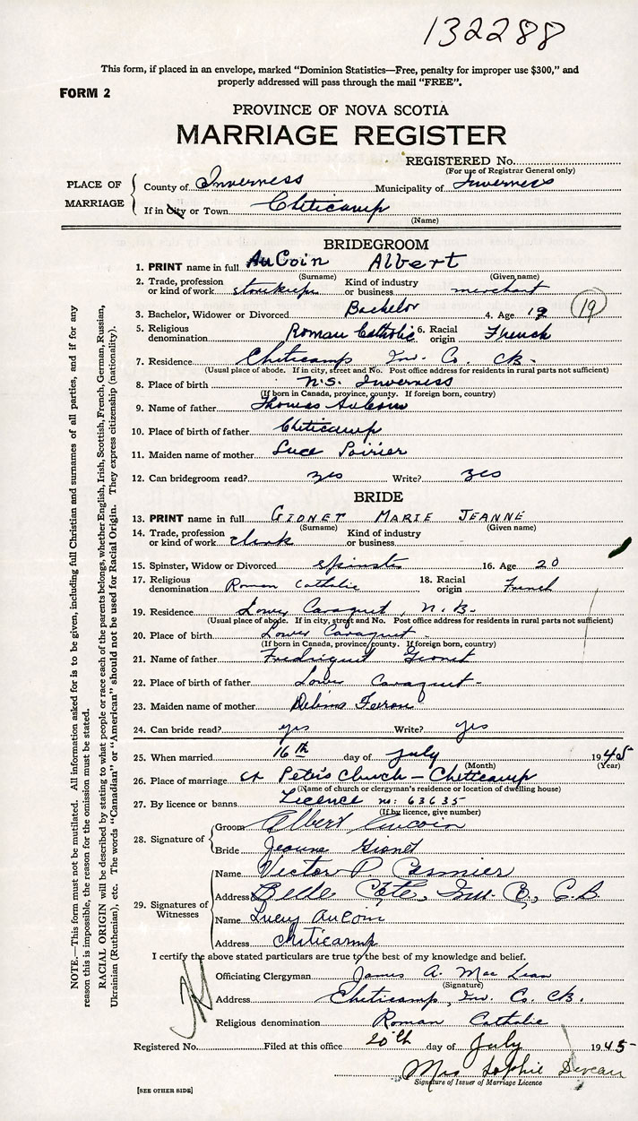 PLACE OF MARRIAGE County of Inverness in City or Town Cheticamp