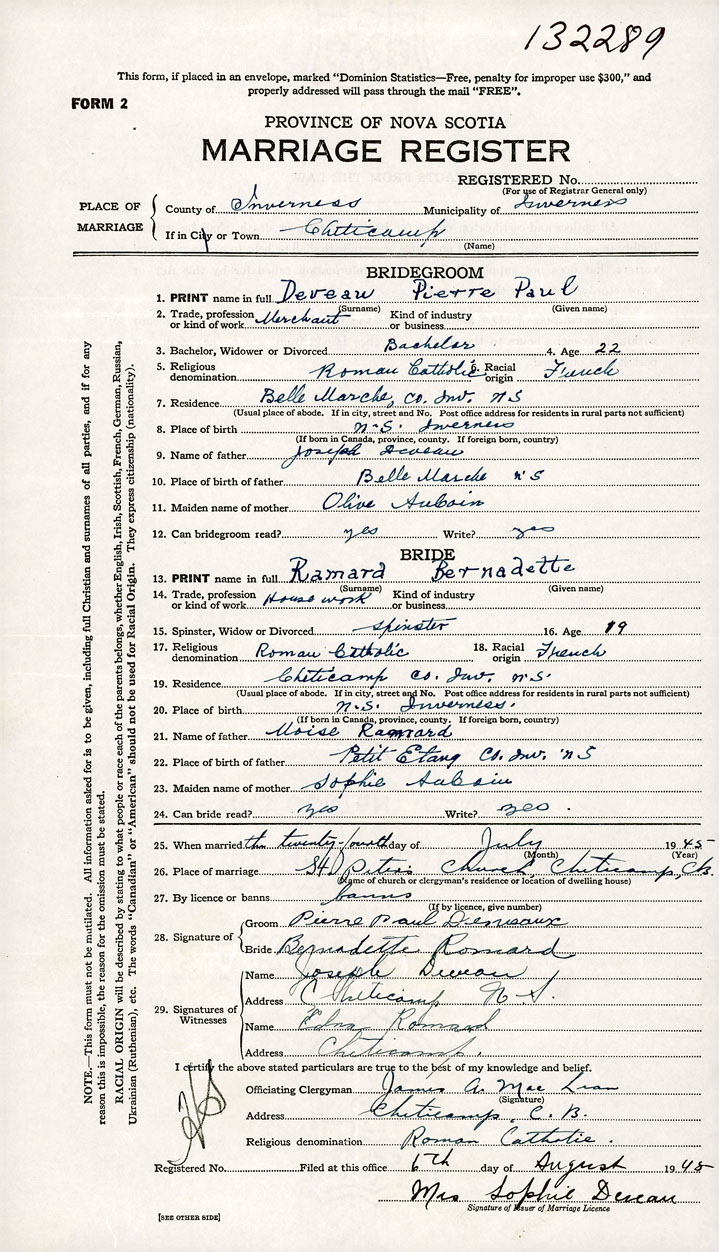 PLACE OF MARRIAGE County of Inverness in City or Town Cheticamp
