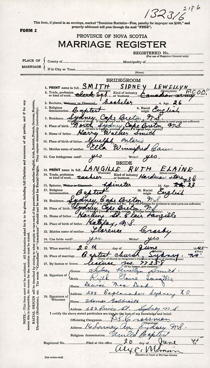 PLACE OF MARRIAGE County of Cape Breton in City or Town Sydney