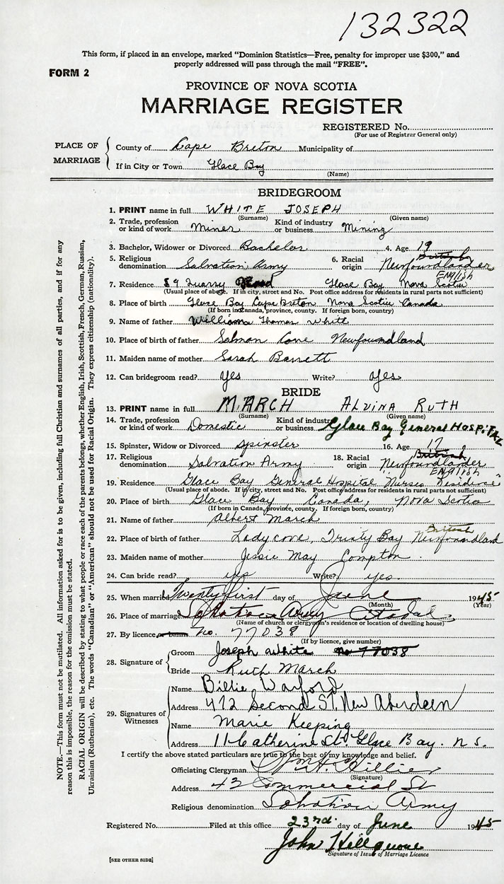 26. Place of marriage Salvation Army Citadel Glace Bay, Cape Breton County