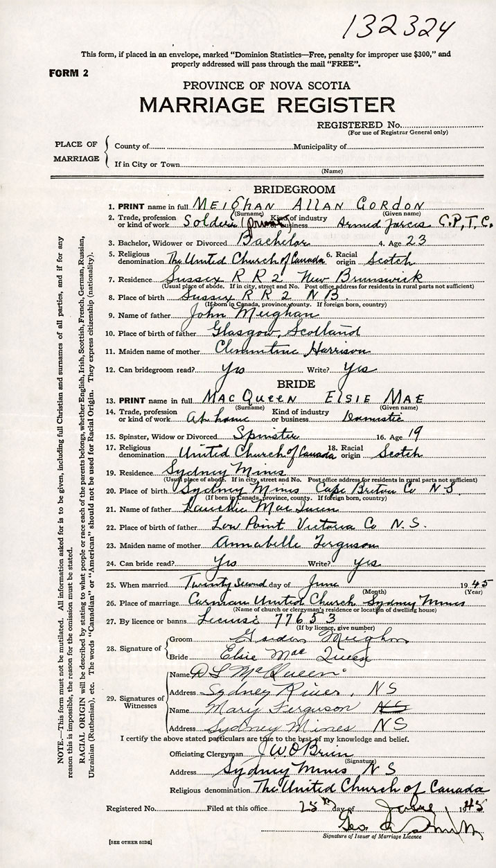 26. Place of marriage carman United Church Sydney Mines, Cape Breton County