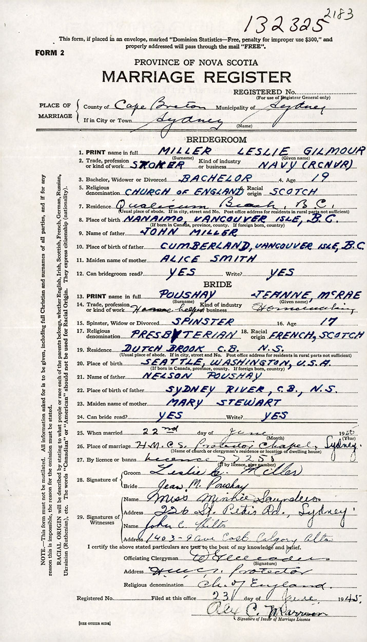 26. Place of marriage HMCS Protector Chapel Sydney, Cape Breton County