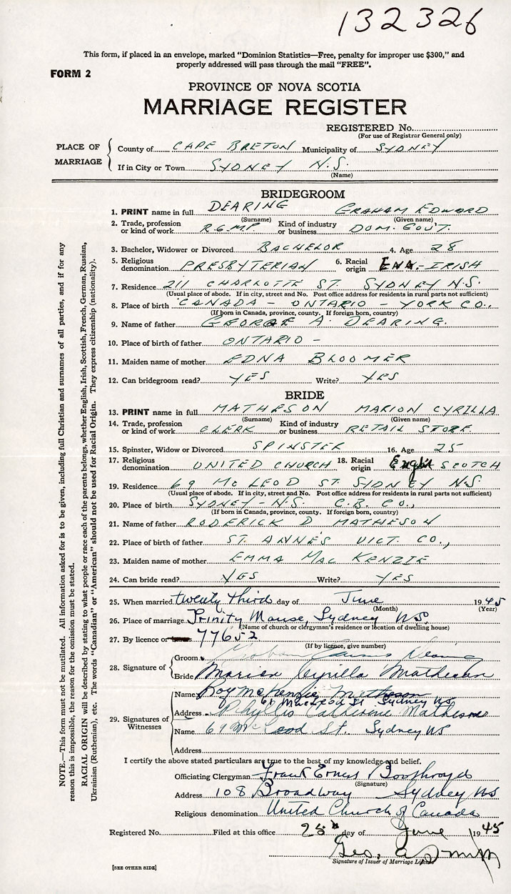PLACE OF MARRIAGE County of Cape Breton in City or Town Sydney