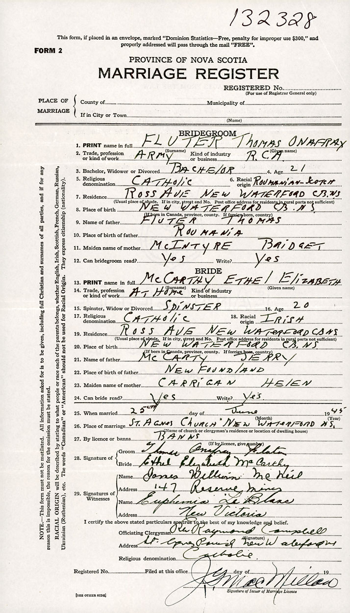 PLACE OF MARRIAGE County of Cape Breton in City or Town New Waterford