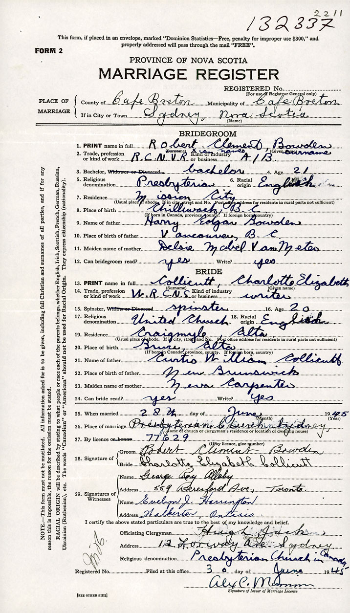 26. Place of marriage Presbyterian Church Sydney, Cape Breton County