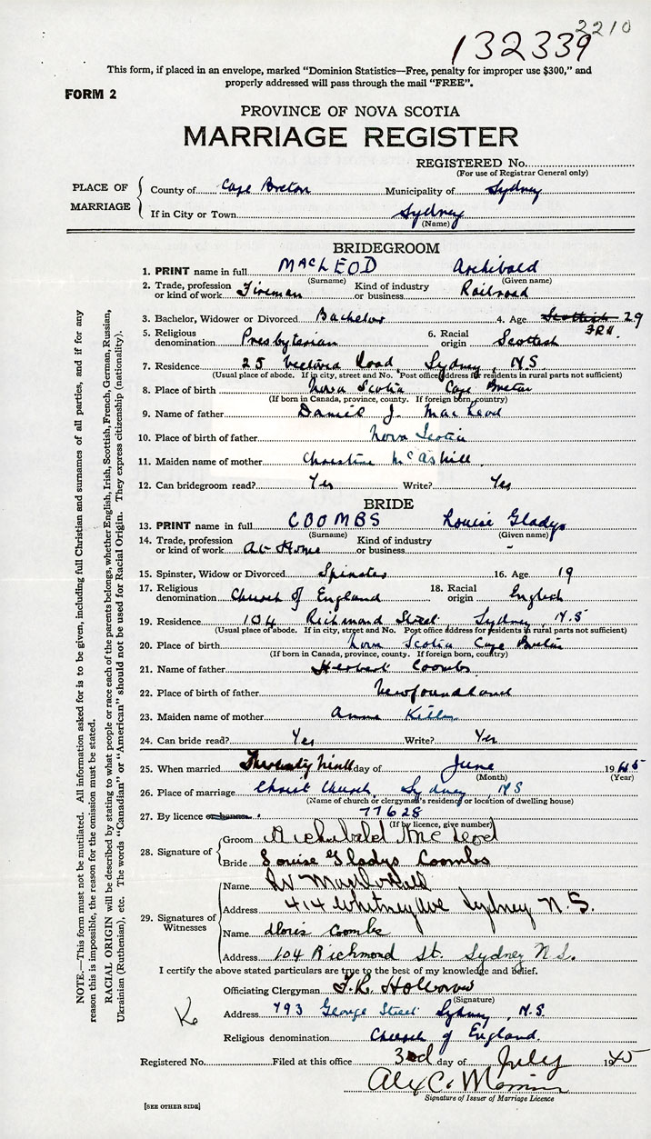 26. Place of marriage Christ Church Sydney, Cape Breton County
