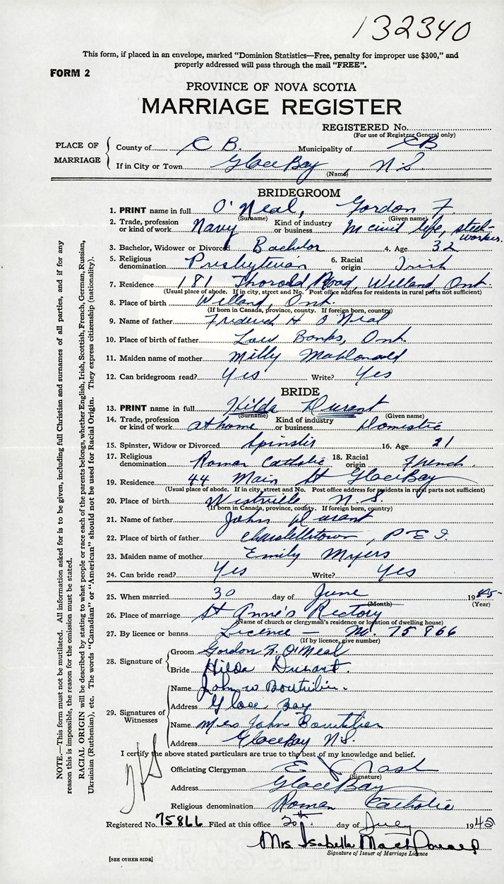 PLACE OF MARRIAGE County of Cape Breton in City or Town Glace Bay