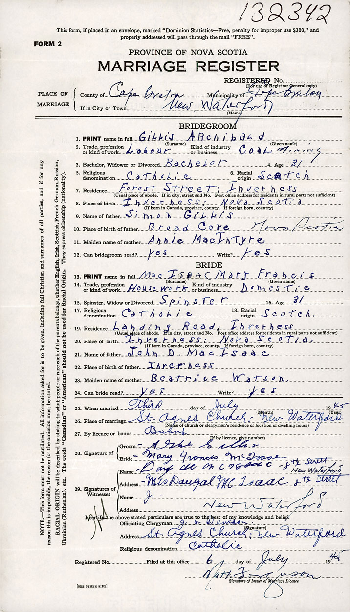 PLACE OF MARRIAGE County of Inverness in City or Town New Waterford