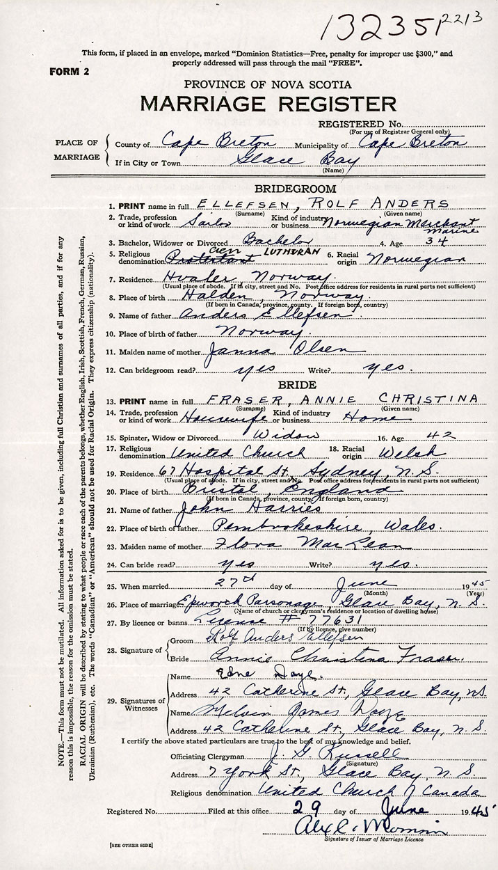 PLACE OF MARRIAGE County of Cape Breton in City or Town Glace Bay