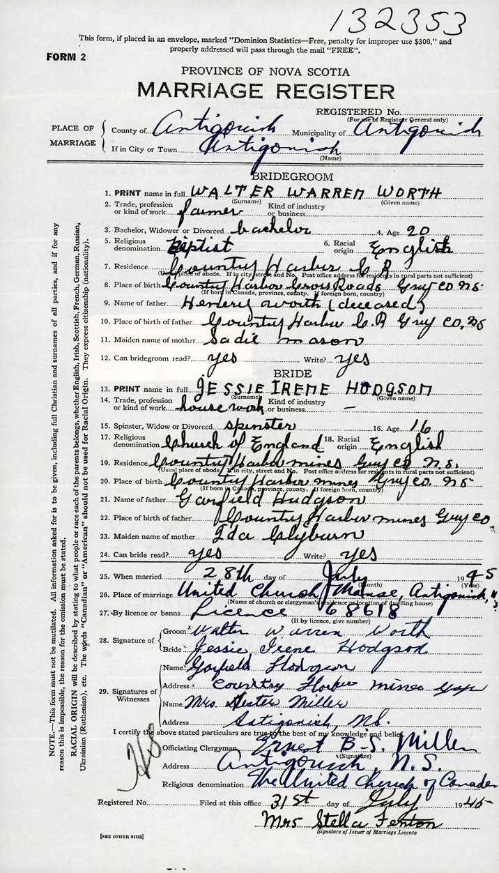 26. Place of marriage United Church Manse Antigonish, Antigonish County