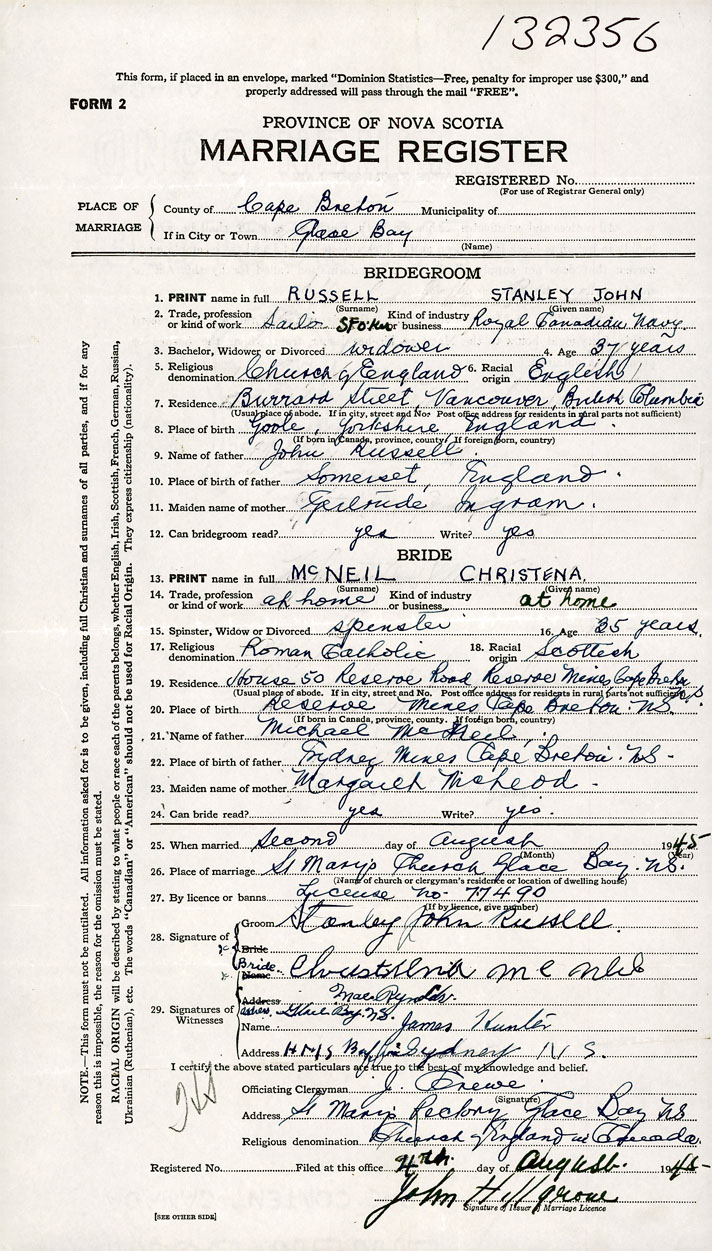 PLACE OF MARRIAGE County of Cape Breton in City or Town Glace Bay