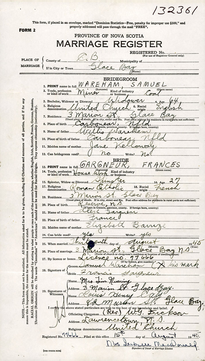 26. Place of marriage 3 Marion Street Glace Bay, Cape Breton County