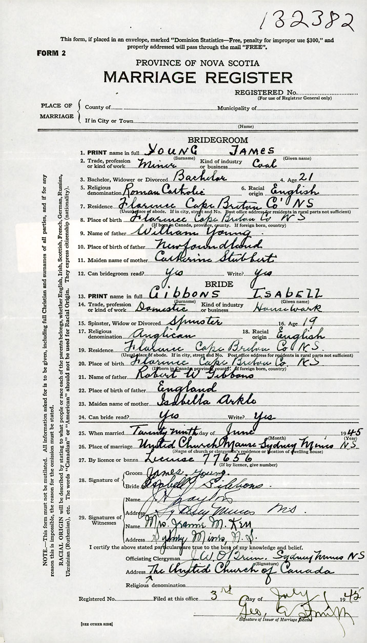 26. Place of marriage United Church Manse Sydney Mines, Cape Breton County
