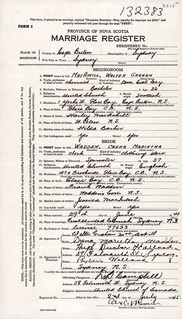 26. Place of marriage First United Church Sydney, Cape Breton County