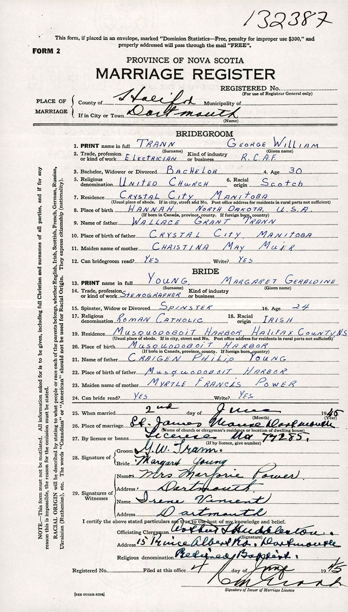 PLACE OF MARRIAGE County of Halifax in City or Town Dartmouth