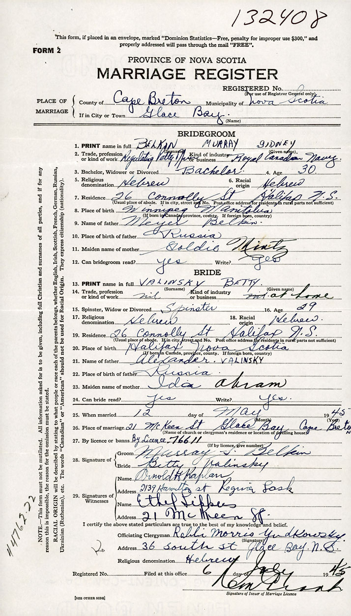 26. Place of marriage 21 McKeen Street Glace Bay, Cape Breton County