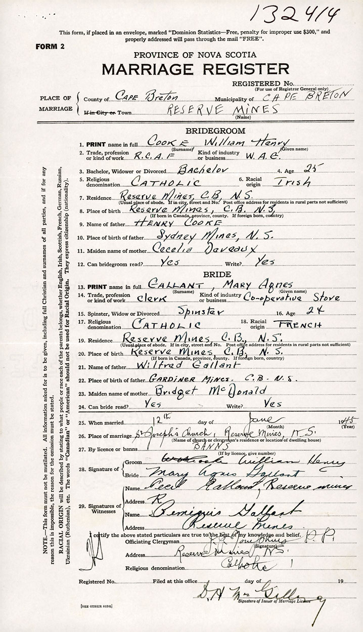 PLACE OF MARRIAGE County of Cape Breton in City or Town Reserve Mines