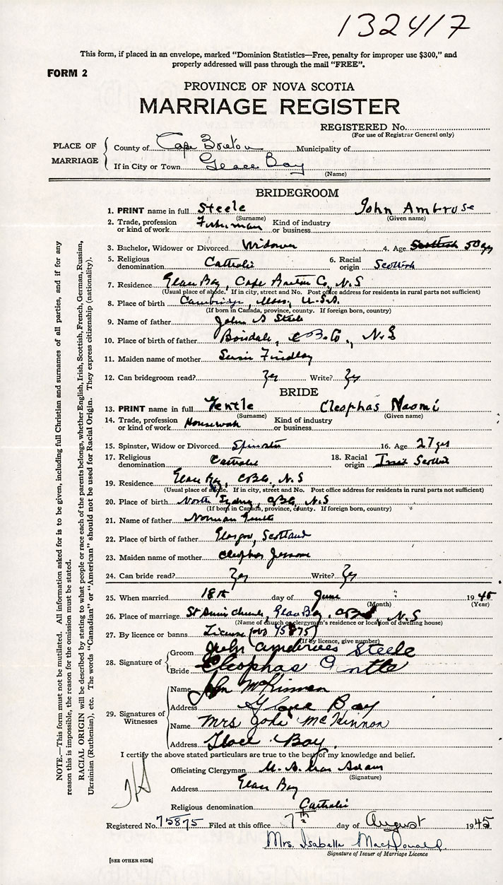 26. Place of marriage St Anne's Church Glace Bay, Cape Breton County